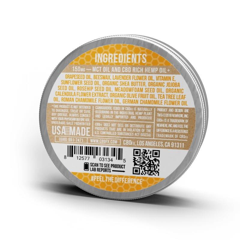 Aceite de semilla de uva, cera de abeja, aceite de lavanda, vitamina E, aceite de girasol, karité orgánica, aceite de semilla de jojoba orgánica, aceite de semilla de rosa mosqueta, extracto de flor de caléndula orgánica, aceite de oliva orgánica, hoja de té, manzanilla romana, aceite de flor de manzanilla alemana, aceite de cáñamo rico en CBD.